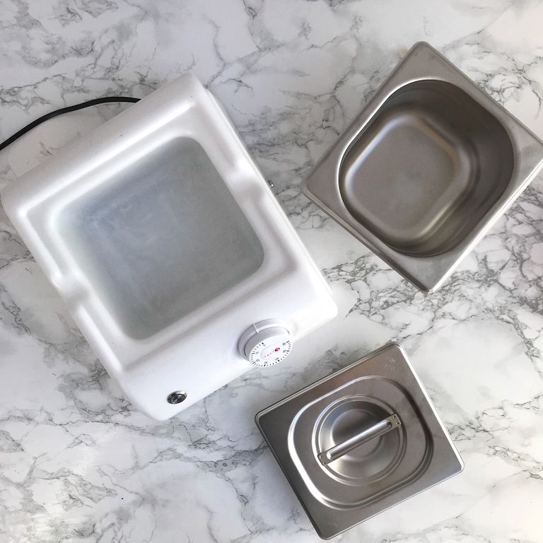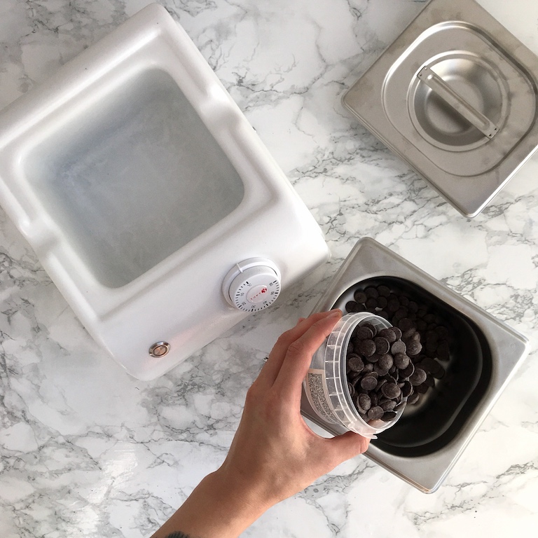 Когда шоколад достиг необходимой температуры в 44-46 градусов, переводим ручку регулятора температуры на 0 и вынимаем металическую ванну из корпуса. Ну, и теперь самое интересное. Вы можете пойти по классической схеме: нагреть шоколад, остудить на мраморной доске и снова слегка нагреть. А можете воспользоваться более простым способом.