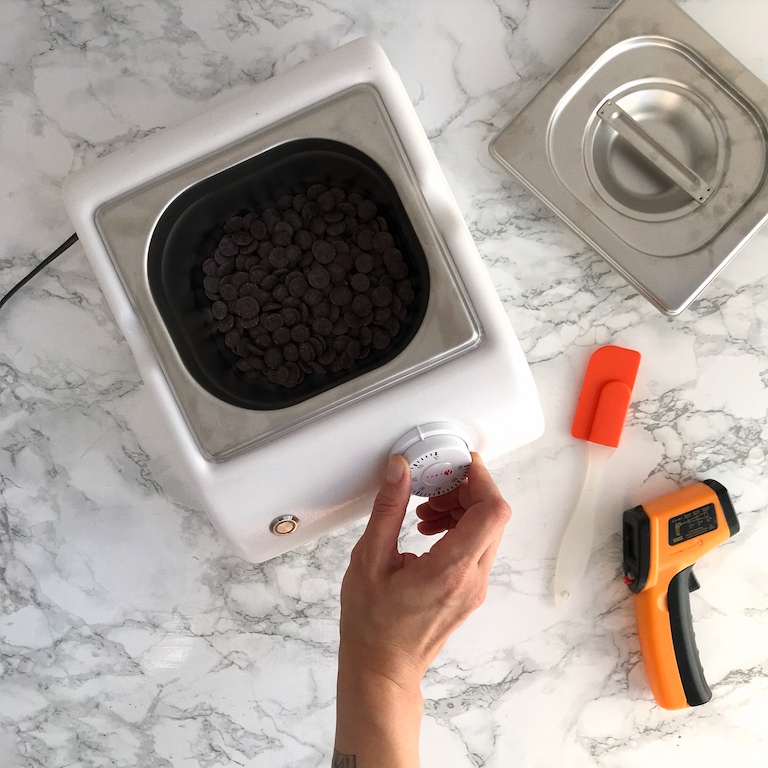 правильно и качественно его растопить. Для этих целей можно воспользоваться несколькими способами: микроволновой печью, водяной баней или, собственно, мармитом для шоколада. В любом из методов дополнительно вам понадобиться пирометр — бесконтактный градусник. Он позволяет точно и оперативно отследить изменение температуры шоколада. Причём абсолютно не важно будете ли вы темперировать шоколад или нет. Сильно нагретый продукт может испортить даже бисквит.