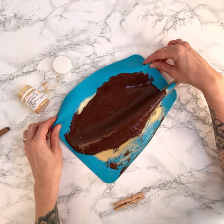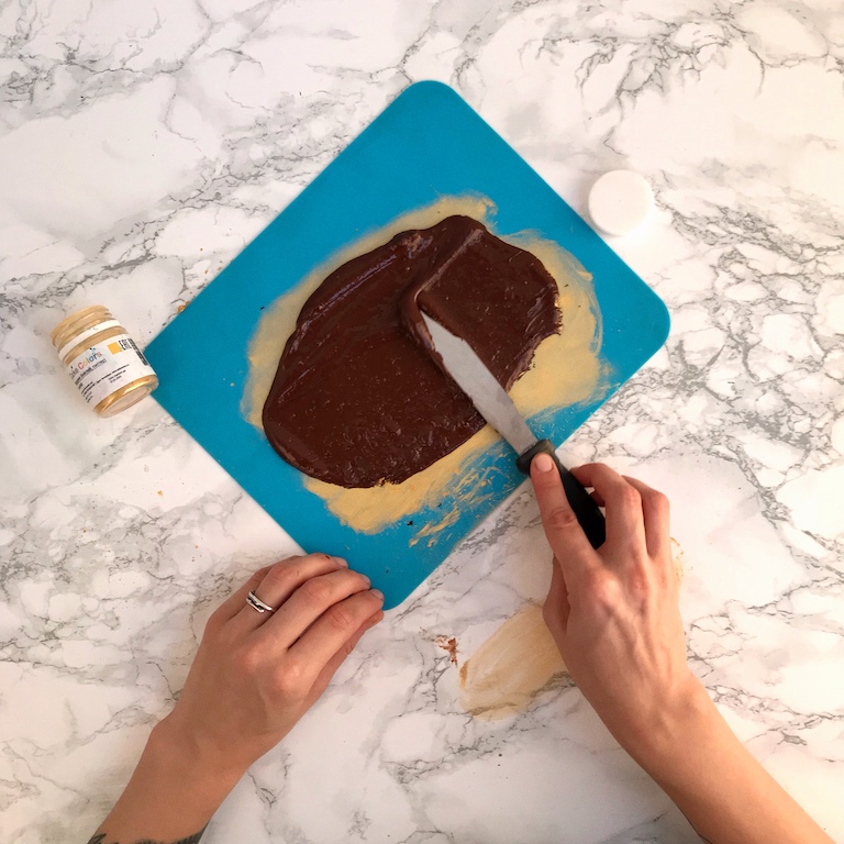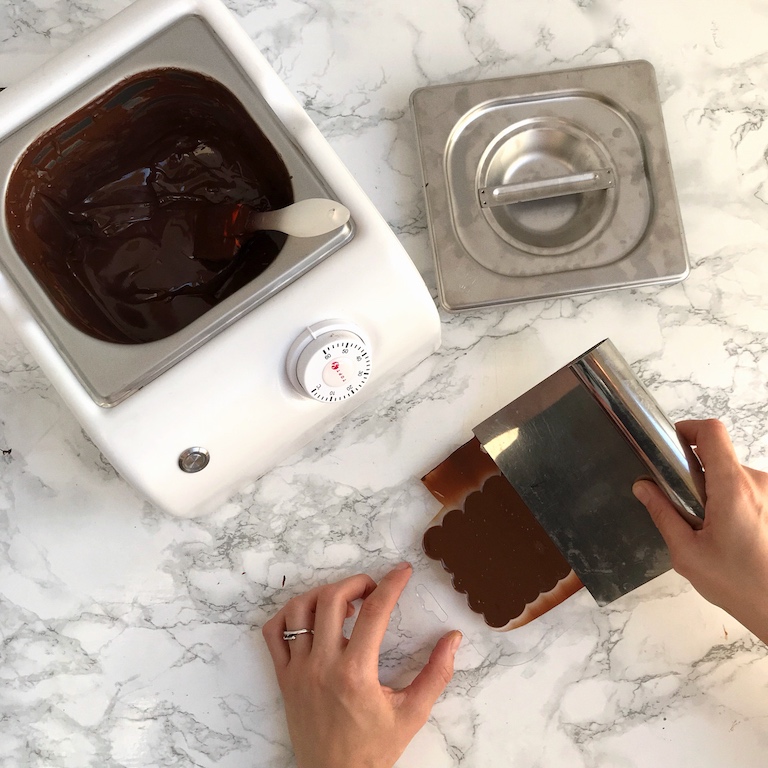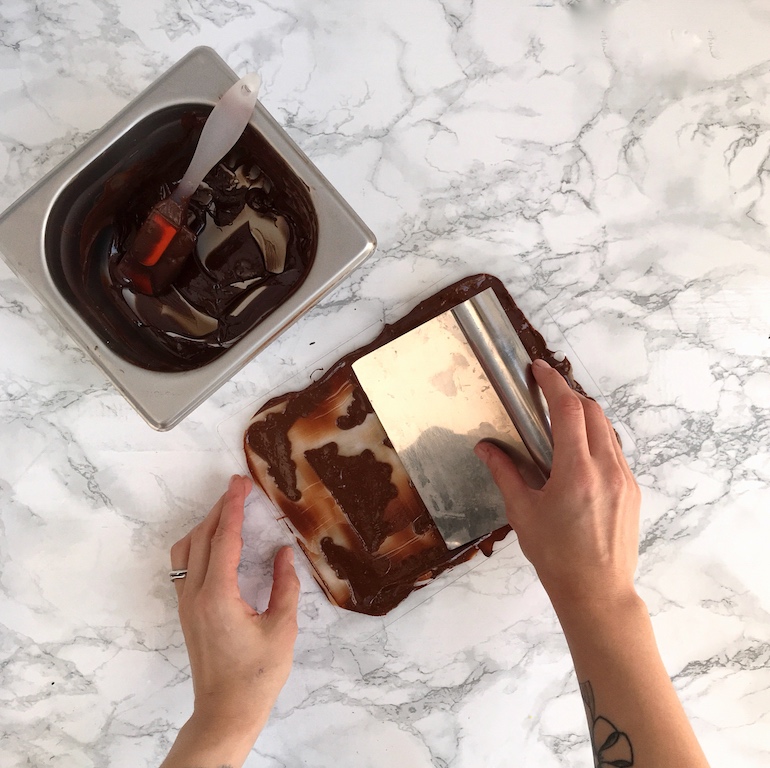 Темперированный шоколад выльем на поверхность и распределим с помощью шпателя.