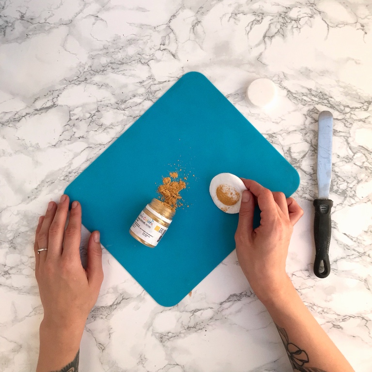 С помощью ватного диска вотрем небольшое количество кандурина «CakeColors» в поверхность коврика.