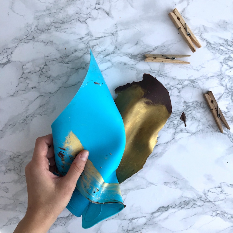 Сформируем произвольные изгибы и закрепим их прищепками. Оставим шоколад до застывания в холодильнике на 5-7 минут.